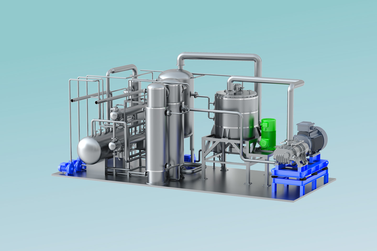 MVR熱泵精餾系統(tǒng)以高效旋轉(zhuǎn)精餾床為基礎(chǔ),利用離心力場代替重力場,強(qiáng)化相與相之間的相對速度和相互接觸,通過強(qiáng)化傳質(zhì)傳熱來提高分離效率縮小設(shè)備體積。 通過在系統(tǒng)中引入適用于小流量、大壓比的螺桿式蒸汽壓縮機(jī),即可實(shí)現(xiàn)MVR循環(huán)熱泵精餾。